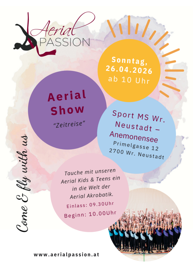 Die Kids & Teens laden zur Aerial Show 2026 Dieses Jahr zum Thema musikalische Zeitreise.Tauche ein in die Musik der 70er, 80er und 90er Jahre und finde heraus was sich
